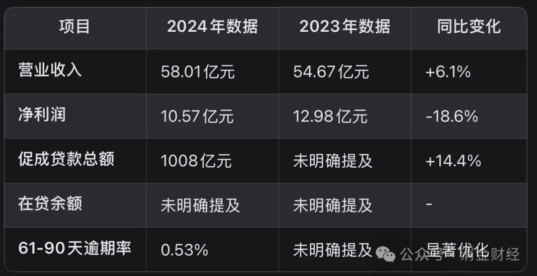 小贏科技在 2024 年的表現可謂是相當出色,實現了營業收入 58.72 億元人民幣,同比增長 22%,延續了上市以來連續第 6 個季度的營收正增長。凈利潤達到 15.399 億元,同比增幅達 29.8%,增速位居行業前列。在業務規模方面,2024 年活躍借款人總數為 523 萬人,較 2023 年的 449 萬人有顯著增加。全年促成貸款總額 1048.89 億元,雖然同比下降 0.6%,但在貸余額突破 523.27 億元,同比增長 6.6%,這表明其貸款業務的穩定性較強。