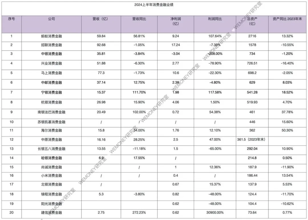 具體來看,數據顯示,截至2024年6月末,螞蟻消金實現營業收入59.85億元,凈利潤為9.25億元;資產總額為2715.95億元,較年初增長13.3%;負債總額為2477.23億元,較年初增長14.3%,資產負債均呈穩健增長態勢。招聯消費金融營業收入為92.68億元,較去年同期下降了1.0%,凈利潤為17.24億元,降幅7.4%。興業消費金融下降幅度明顯。上半年,興業消費金融實現營業收入51.88億元;凈利潤2.77億元,較去年同期暴跌78.09%。對于興業消金的業績,興業銀行在半年報中表示,興業消費金融堅守普惠金融主責主業,主動順應內外部形勢變化。財報中提到,馬上消費金融去年上半年實現凈利潤同比增長130.71%,由于去年上半年的凈利潤基數較高,導致今年本期凈利潤同比下降20.66%。中郵消金、中銀消金、杭銀消金和南銀法巴消金的營收均超過了20億元。其中南銀法巴消金的營收增速高達102.57%,延續了高增長勢頭。這幾家背靠銀行的消金公司都取得了不錯的增長勢頭。營收在10億元-20億元之間的機構有四家,分別為中原消金、海爾消金、寧銀消金和長銀五八消金。其中,中原消金上半年營收16.16億元,增速達到28.25%;海爾消金和寧銀消金營收增速亮眼,分別高達54.79%和111.71%。錦程消費金融、陽光消費金融等尾部機構業績下滑。截至2024年6月末,陽光消費金融的總資產為104.40億元,較年初減少10.62%。上半年實現凈利潤0.62億元,同比下降39.2%。數據顯示,截至2024年6月末,錦程消費金融總資產達124.4億元,較年初減少11.7%。同時,營業收入、凈利潤卻出現下滑。上半年,錦程消費金融實現營業收入5.3億元,同比下降3.71%;凈利潤8022.55萬元,同比下降49.62%。素喜智研高級研究員蘇筱芮對此表示,部分腰部機構業績逆勢而上,一方面是由于其經營策略得當,年內在股東協同、機構合作等方面有所進步;另一方面也是因為其規模基數相對較小,在業績增長、策略轉向等方面相較頭部機構更具優勢。