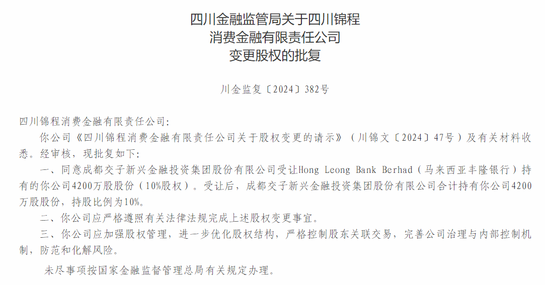 12月12日,四川金融監(jiān)管局發(fā)布批復(fù),同意成都交子新興金融投資集團股份有限公司受讓Hong Leong Bank Berhad(馬來西亞豐隆銀行)持有的錦程消費金融4200萬股股份(10%股權(quán))。