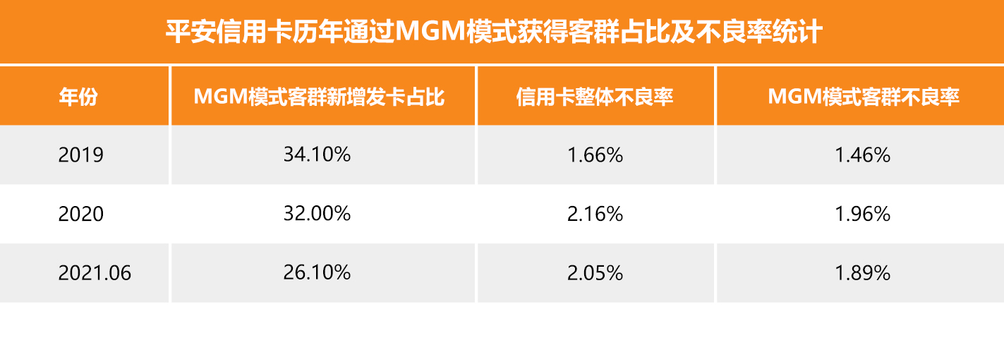 2019年,平安信用卡通過MGM模式引流的客戶在當年信用卡新增發(fā)卡中占比達34%,該模式為平安信用卡提供了一個新的優(yōu)質(zhì)的獲客渠道。此外,該模式帶來的用戶質(zhì)量相比之前也有所提高。據(jù)年報數(shù)據(jù)顯示,平安信用卡通過 MGM 模式獲得的用戶所產(chǎn)生的不良率連續(xù)三年低于信用卡整體不良率。