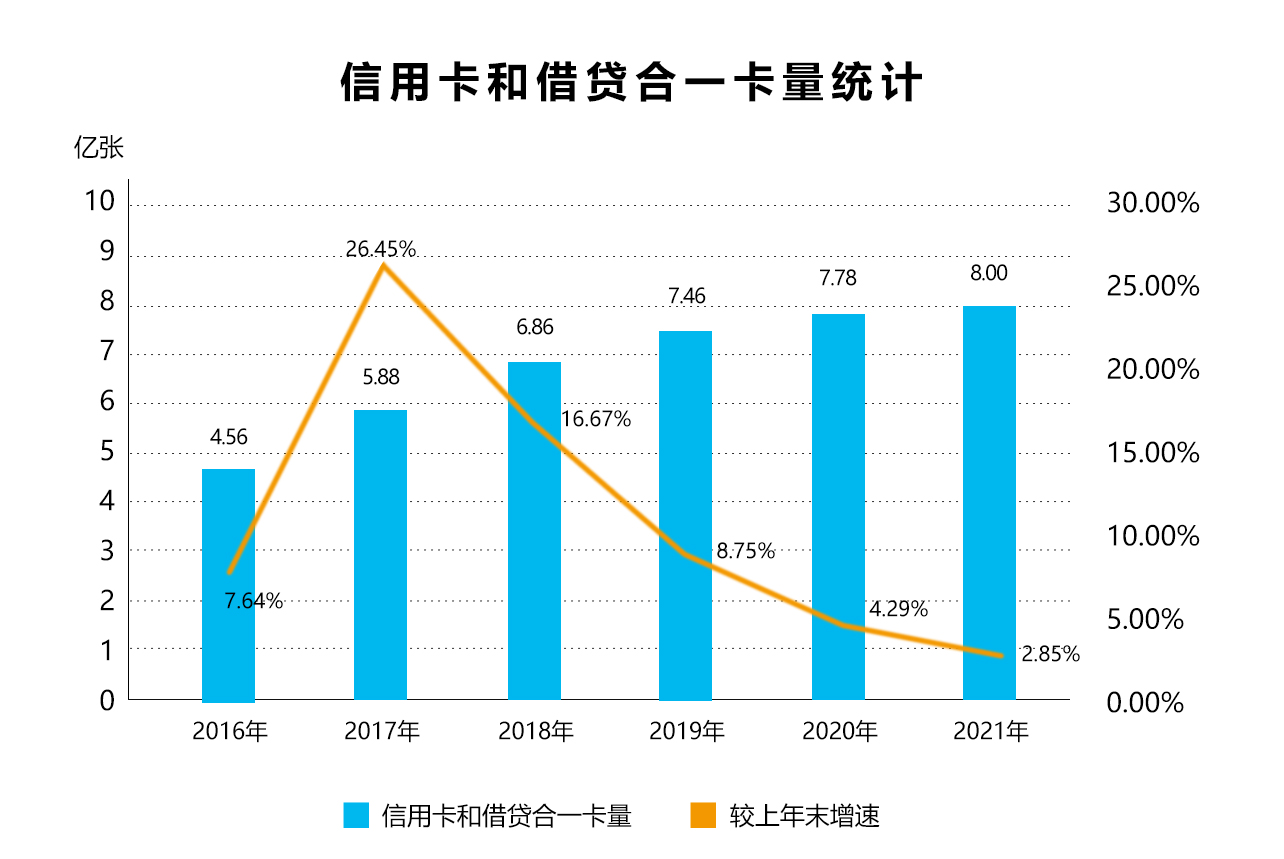 4月2日,中國人民銀行公布了《2021年支付體系運行總體情況》,根據文件顯示,截至2021年末,我國信用卡和借貸合一卡8.00億張,較上年末增長 2.85%。人均持有銀行卡6.55張,其中,人均持有信用卡和借貸合一卡0.57張。