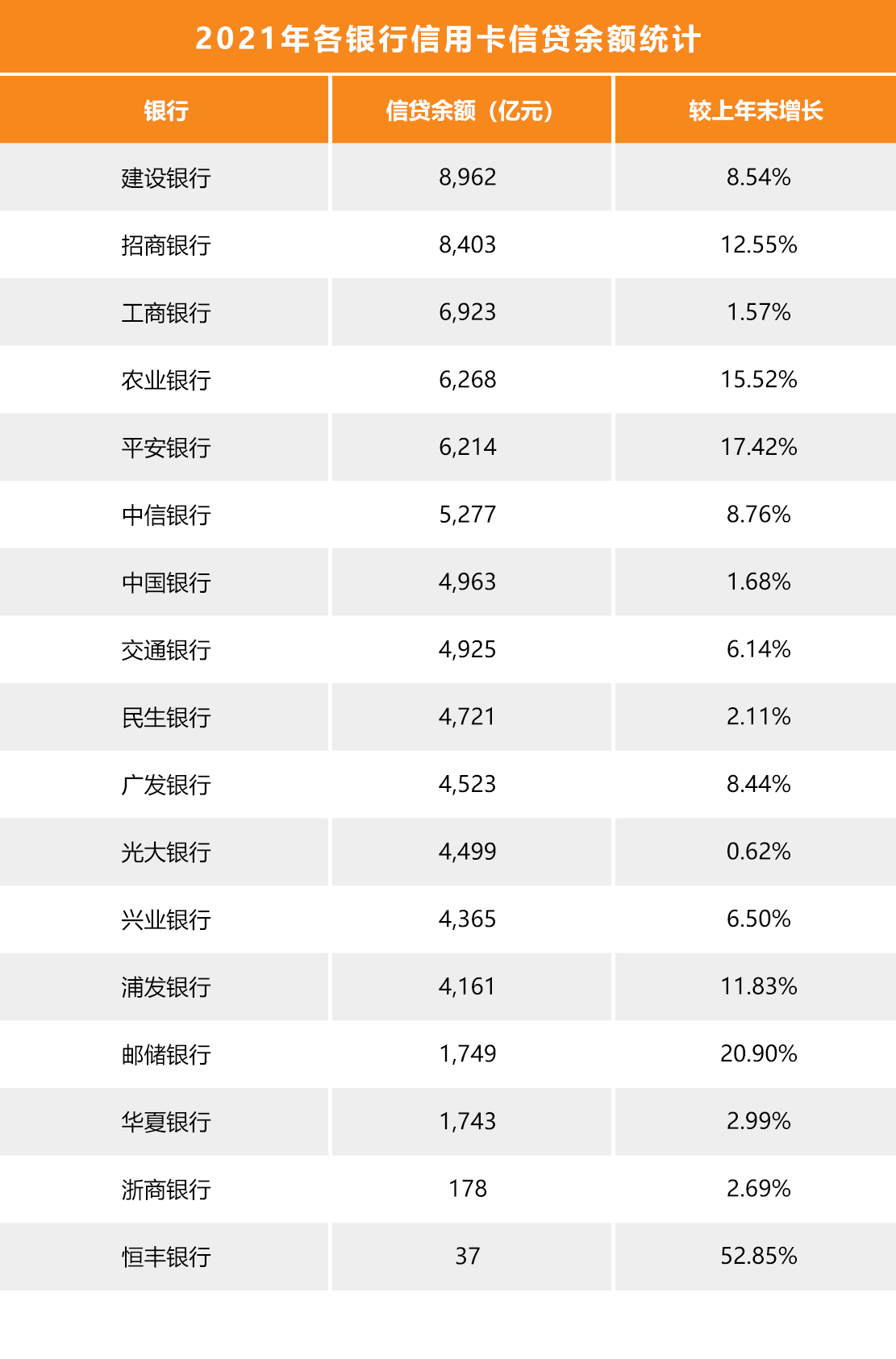 在信用卡業務中,信用卡透支余額基本上反映了信用卡的活躍程度,也是衡量信用卡使用情況的一個非常重要的指標。2021年,共有兩家銀行信用卡信貸余額超過8,000億元,分別為建設銀行和招商銀行,建設銀行信用卡信貸余額更是高達近9,000億元;其次為工商銀行、農業銀行和平安銀行3家,信貸余額均處于6,000億元至7,000億元之間;而后為中信銀行,信貸余額達5,277億元。