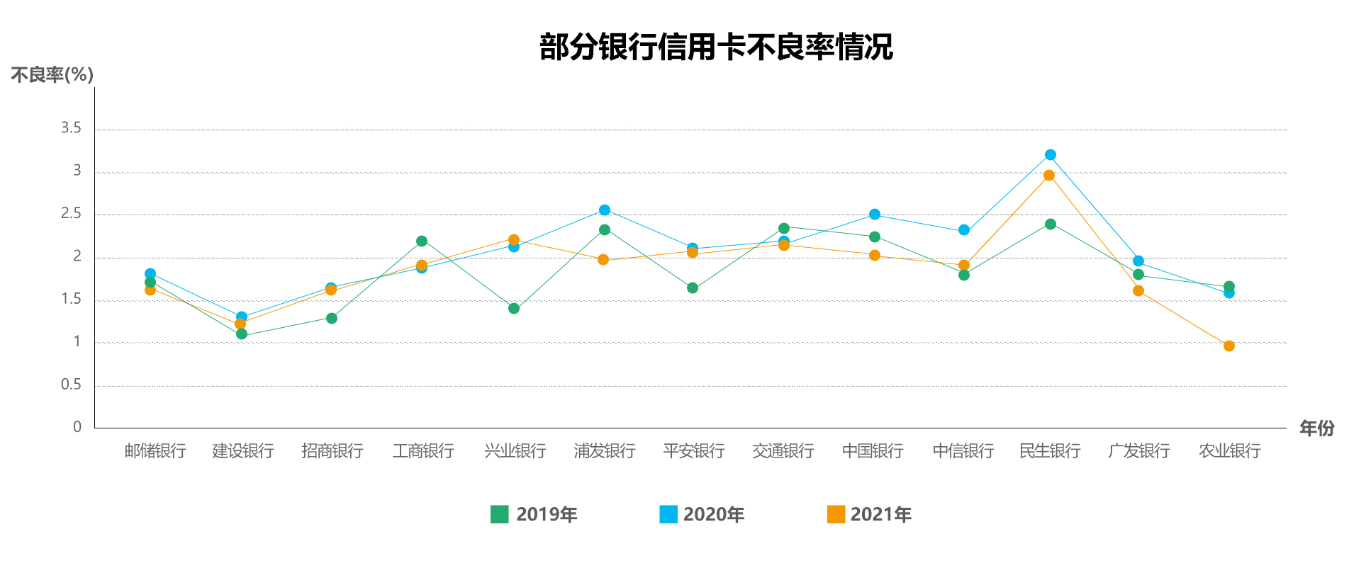 此外,2021年信用卡不良率最低的為農業銀行,信用卡不良率低至0.99%,同時也是農業銀行近10年來信用卡不良率最低水平,其次為建設銀行信用卡不良率為1.33%。