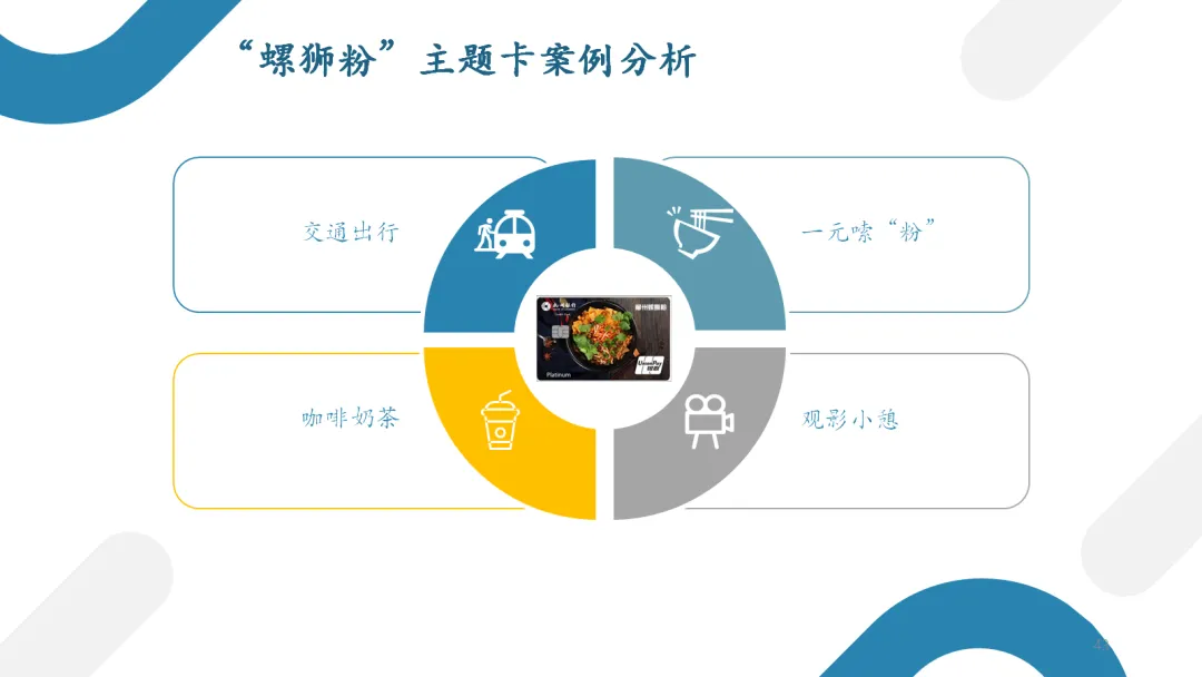 前幾年為某城商行策劃一款“嗦粉”主題信用卡產品時,是以嗦粉消費為主體,在吸引喜愛消費螺獅粉的客群主動辦卡和用卡的同時,考慮到這一主題消費還可以帶動其它潛在消費,為此還為該卡設計了圍繞主題消費相關的在出行、休閑、娛樂等方面的權益,形成一個針對該卡目標客群在日常休閑生活方面構建起來的多元消費場景生態圈,從幾個角度圍繞主題權益帶動用戶辦卡和用卡。