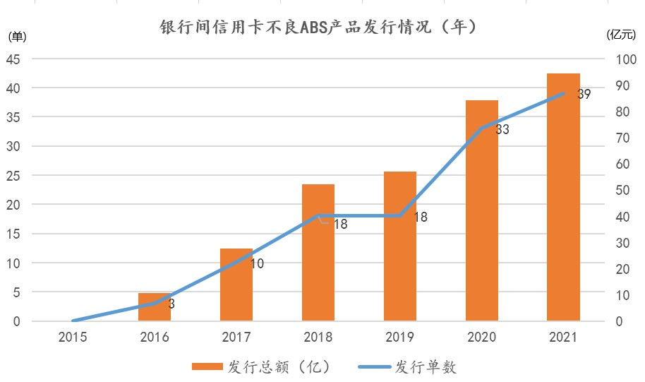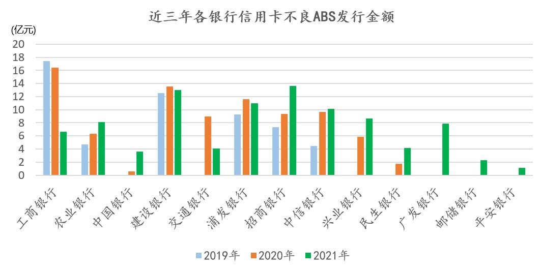 2021年,共13家國有銀行和股份制銀行發行總計39筆信用卡不良資產證券化ABS產品,發行規模為94.22億元,涉及信用卡不良資產約1,133億元,較2020年發行筆數及規模呈增長趨勢。從發起機構來看,新增了郵儲、廣發、平安三家銀行,且三家銀行均為首次發行信用卡類不良ABS產品(廣發銀行曾在銀登中心發過信用卡不良收益權轉讓公告,在銀行間市場發行信用類不良ABS則為首次);從發行規模來看,較2020年發行的84億元同比增長12%,相應的不良資產原始債權規模增長3.3%。整體來看,近幾年來各銀行利用資產證券化方式進行信用卡不良資產處置的模式已經非常成熟,預計隨著個貸不良貸款批量轉讓試點工作的推進,這兩種模式將會充分發揮拓寬金融業不良資產處置渠道,加強不良資產處置力度的作用。未來可重點關注不同發起機構、不同逾期賬齡條件下,信用卡不良ABS產品在存續期的基礎資產回款表現,為不良資產投資決策積累參考依據。