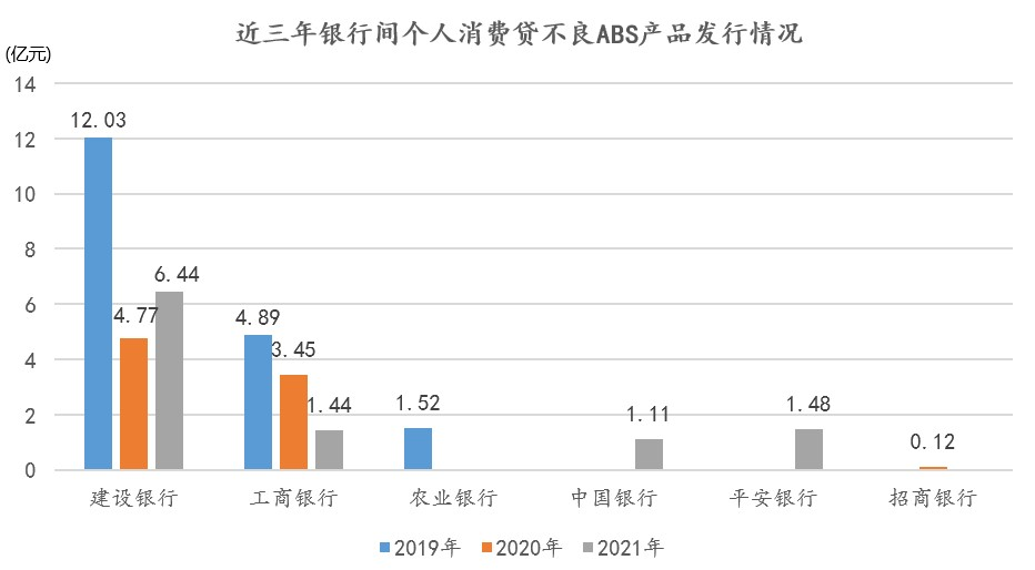 2021年,建行、工行、中行、平安共4家銀行發行6單以個人消費貸為基礎資產的不良資產證券化ABS產品,發行金額共計10.47億元,涉及不良資產總額64.3億元。自2016年不良資產證券化試點重啟以來,僅建行和工行發行過以個人消費貸為基礎資產的不良ABS產品,中行、招行、平安也在近兩年開始嘗試,可能與銀行自身細分產品規模和歷史回收數據積累豐富程度有關。