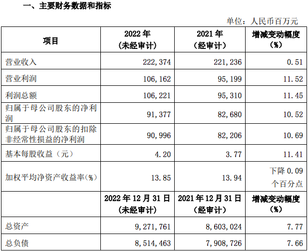 報告顯示,2022 年度,興業銀行實現利潤總額 1,062.21 億元,同比增長 11.45%;歸屬于母公司股東的凈利潤 913.77 億元,同比增長 10.52%,盈利能力保持較好水平。