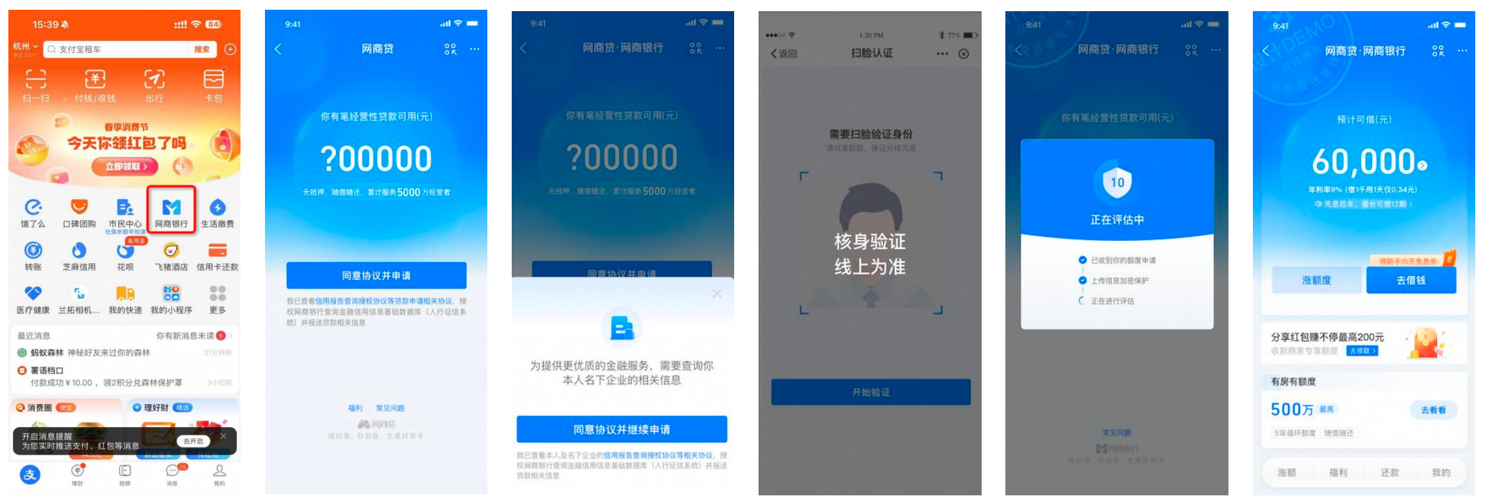 網商銀行的「網商貸」屬于第二種模式,客戶在支付寶的「網商銀行」入口,只需要3個步驟(點擊網商貸-同意協議-完成人臉識別)即可完成額度審批。