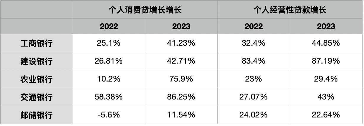 其中,除了猛攻個人經(jīng)營貸的建行之外,交行也不遑多讓,2022年和2023年,交行在消費貸業(yè)務(wù)上分別實現(xiàn)了58%和86%的同比增長。