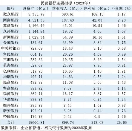開(kāi)業(yè)以來(lái),民營(yíng)銀行結(jié)合股東優(yōu)勢(shì)、區(qū)域稟賦等探索出多種發(fā)展模式,在服務(wù)小微、民營(yíng)企業(yè)的過(guò)程中發(fā)揮了重要作用。由于沒(méi)有線下網(wǎng)點(diǎn),大部分民營(yíng)銀行定位于互聯(lián)網(wǎng)和數(shù)字化發(fā)展方向,如眾邦銀行定位“互聯(lián)網(wǎng)交易銀行”,蘇商銀行定位于“科技驅(qū)動(dòng)的O2O銀行”。“數(shù)字技術(shù)是蘇商銀行高效服務(wù)民營(yíng)中小微企業(yè)的法寶,成本低,效率高。成立7年來(lái),蘇商銀行已累計(jì)服務(wù)民營(yíng)企業(yè)客戶(hù)近300萬(wàn)戶(hù),快捷投放純信用貸款4000多億元,戶(hù)均僅9萬(wàn)元。”蘇商銀行董事長(zhǎng)黃金老11月16日在貨幣金融圓桌會(huì)議?2024秋暨“金融支持民營(yíng)經(jīng)濟(jì)高質(zhì)量發(fā)展”研討會(huì)上表示。再如微眾銀行發(fā)布的《2023年可持續(xù)發(fā)展報(bào)告》稱(chēng),截至2023年末該行已累計(jì)服務(wù)個(gè)人客戶(hù)近4億,累計(jì)授信小微企業(yè)超140萬(wàn)家。在此過(guò)程中,民營(yíng)銀行資產(chǎn)規(guī)模和盈利能力也實(shí)現(xiàn)增長(zhǎng),抗風(fēng)險(xiǎn)能力穩(wěn)步提升。據(jù)界面新聞?dòng)浾呓y(tǒng)計(jì),民營(yíng)銀行總資產(chǎn)由2019年的0.9萬(wàn)億元增長(zhǎng)至2023年的2萬(wàn)億元;凈利潤(rùn)由2019年的82億元增長(zhǎng)至2023年的204億元。從資產(chǎn)質(zhì)量看,截至2023年末,民營(yíng)銀行不良貸款率1.55%,略低于行業(yè)的平均水平,也低于城商行、農(nóng)商行。央行金融機(jī)構(gòu)評(píng)級(jí)則顯示,2023年二季度城商行、農(nóng)村金融機(jī)構(gòu)、村鎮(zhèn)銀行高風(fēng)險(xiǎn)機(jī)構(gòu)數(shù)量分別為14家、191家、132家,而民營(yíng)銀行無(wú)高風(fēng)險(xiǎn)機(jī)構(gòu)。上海金融與發(fā)展實(shí)驗(yàn)室首席專(zhuān)家曾剛表示,在更高的凈息差下,風(fēng)險(xiǎn)成本表現(xiàn)還優(yōu)于行業(yè)平均,表明民營(yíng)銀行借助數(shù)字技術(shù)和場(chǎng)景所構(gòu)建起的風(fēng)控體系,已成為其核心競(jìng)爭(zhēng)力的重要組成部分。從民營(yíng)銀行內(nèi)部看,“二八效應(yīng)”顯著,微眾銀行、網(wǎng)商銀行遙遙領(lǐng)先于其他民營(yíng)銀行。企業(yè)預(yù)警通數(shù)據(jù)顯示,2023年微眾銀行、網(wǎng)商銀行資產(chǎn)合計(jì)約萬(wàn)億,占全部民營(yíng)銀行的一半;二者營(yíng)業(yè)收入、凈利潤(rùn)合計(jì)分別為581億元、150億元,分別占全部民營(yíng)銀行的65%、70%。