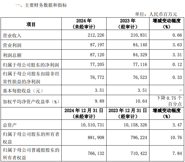 快報顯示,2024年興業銀行積極應對內外部環境變化,持續強化戰略執行,經營情況保持穩健。2024年度,實現營業收入2,122.26億元,較上一年同比增長0.66%,報告期內實現利潤總額 871.20 億元,同比增長 3.31%;歸屬于母公司股東的凈利潤 772.05 億元,同比增長 0.12%。