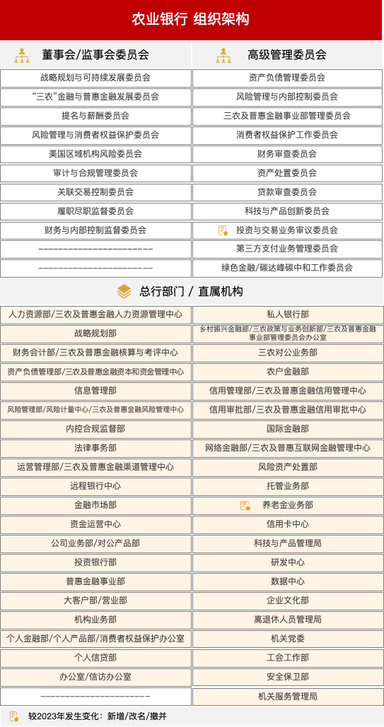 與2023年披露的信息相比,農(nóng)業(yè)銀行組織架構(gòu)變動如下。