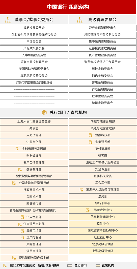 與2023年披露的信息相比,中國銀行組織架構(gòu)調(diào)整如下。