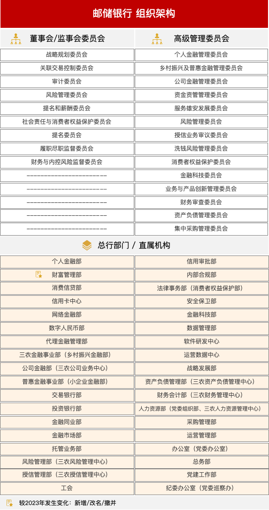 與2023年披露的信息相比,郵儲銀行組織架構(gòu)調(diào)整如下。