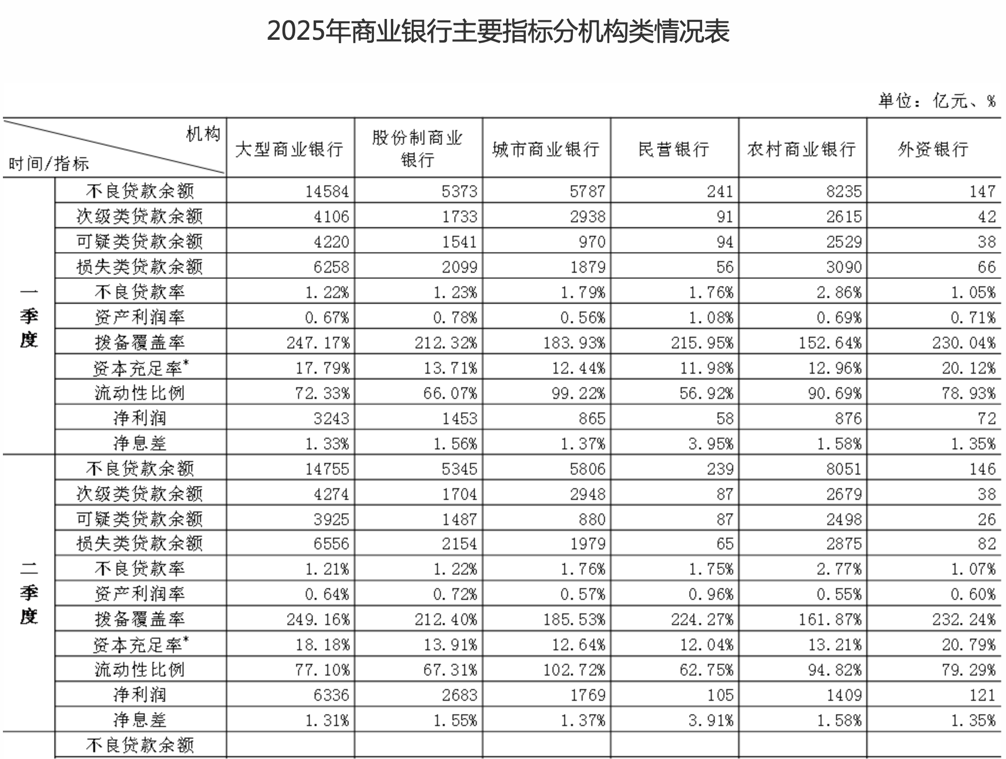 2025年二季度末,商業銀行(不含外國銀行分行)資本充足率3為15.58%,較上季末上升0.30個百分點;一級資本充足率3為12.46%,較上季末上升0.28個百分點;核心一級資本充足率3為10.93%,較上季末上升0.24個百分點。