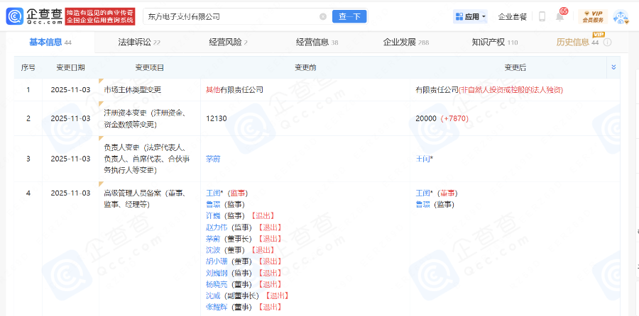企查查信息顯示,11月3日,東方電子支付有限公司(下稱“東方支付”)發生一系列工商信息變更,原有股東全部退出,法定代表人變更,同時發生增資。