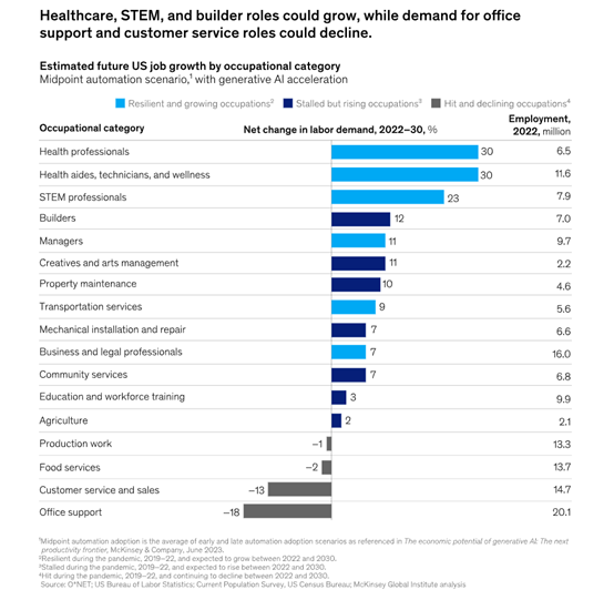 麥肯錫估計到2030年,最容易接觸到生成式AI的職業,最有機會獲得全新的工作崗位。